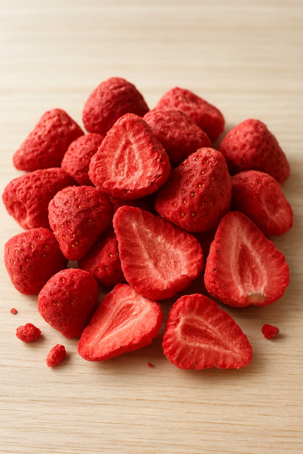 Liofilizowane owoce to owoce, które zostały wysuszone metodą liofilizacji – czyli specjalnego suszenia przez zamrażanie i odparowanie wody w próżni. Dzięki temu zachowują prawie wszystkie swoje właściwości.