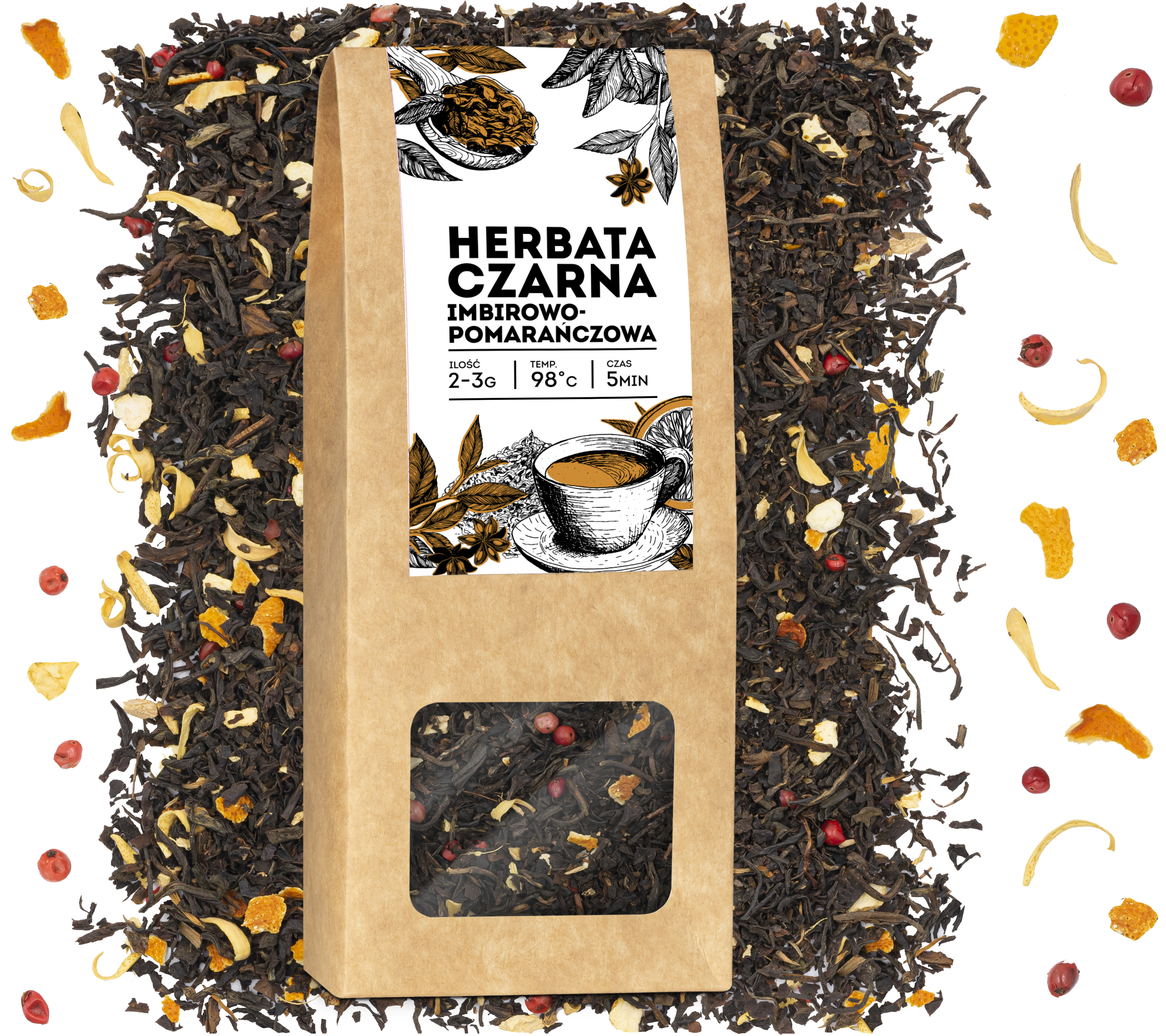 Składniki: herbata czarna liściasta, imbir, skórka pomarańczy, aromat