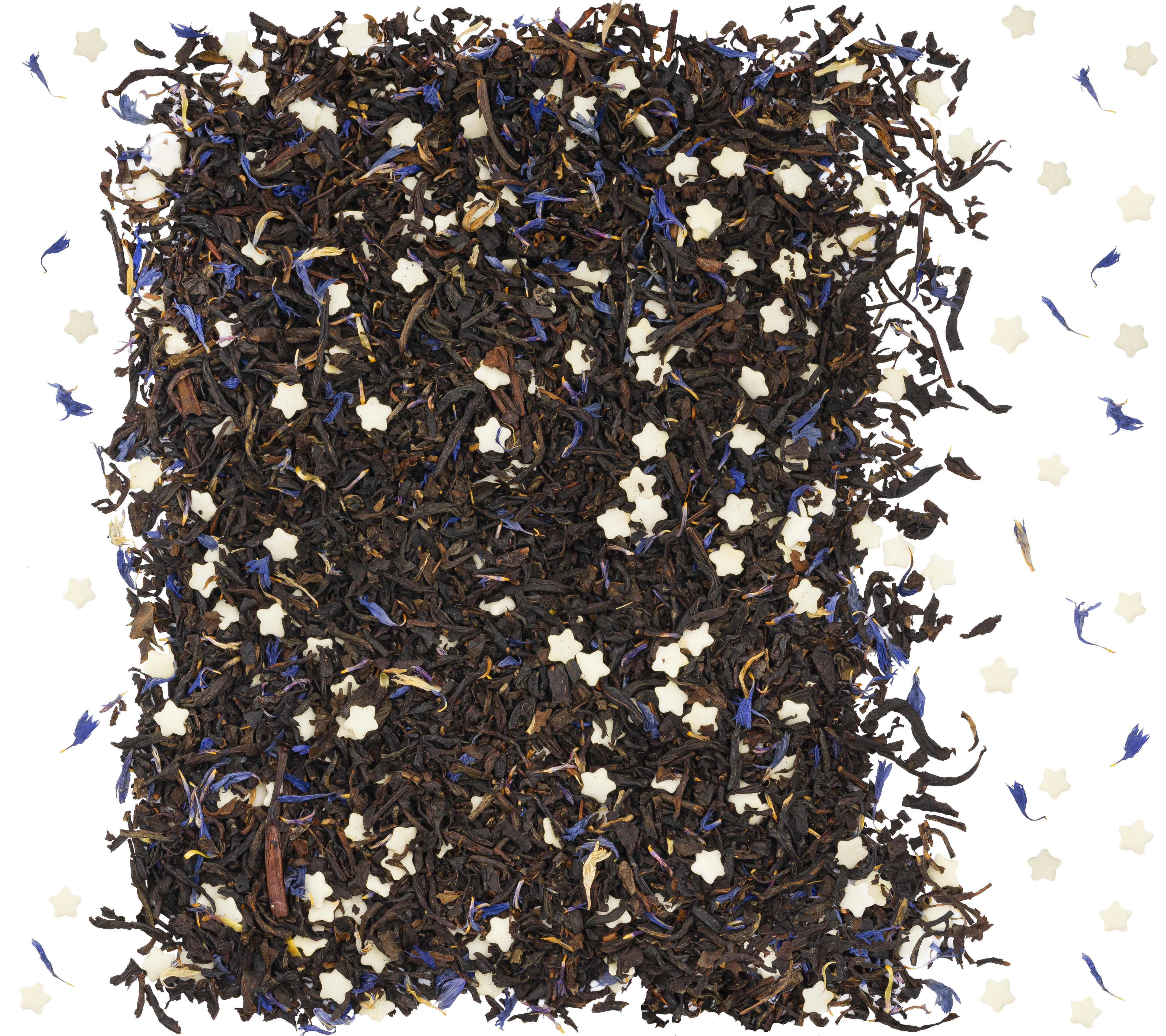 Składniki: Yunnan black, dekoracje cukrowe (cukeir, mąka ryżowa, plej ryżowy, skrobia żiemniaczana, aromat, barwnik E101), bławatek, aromat.