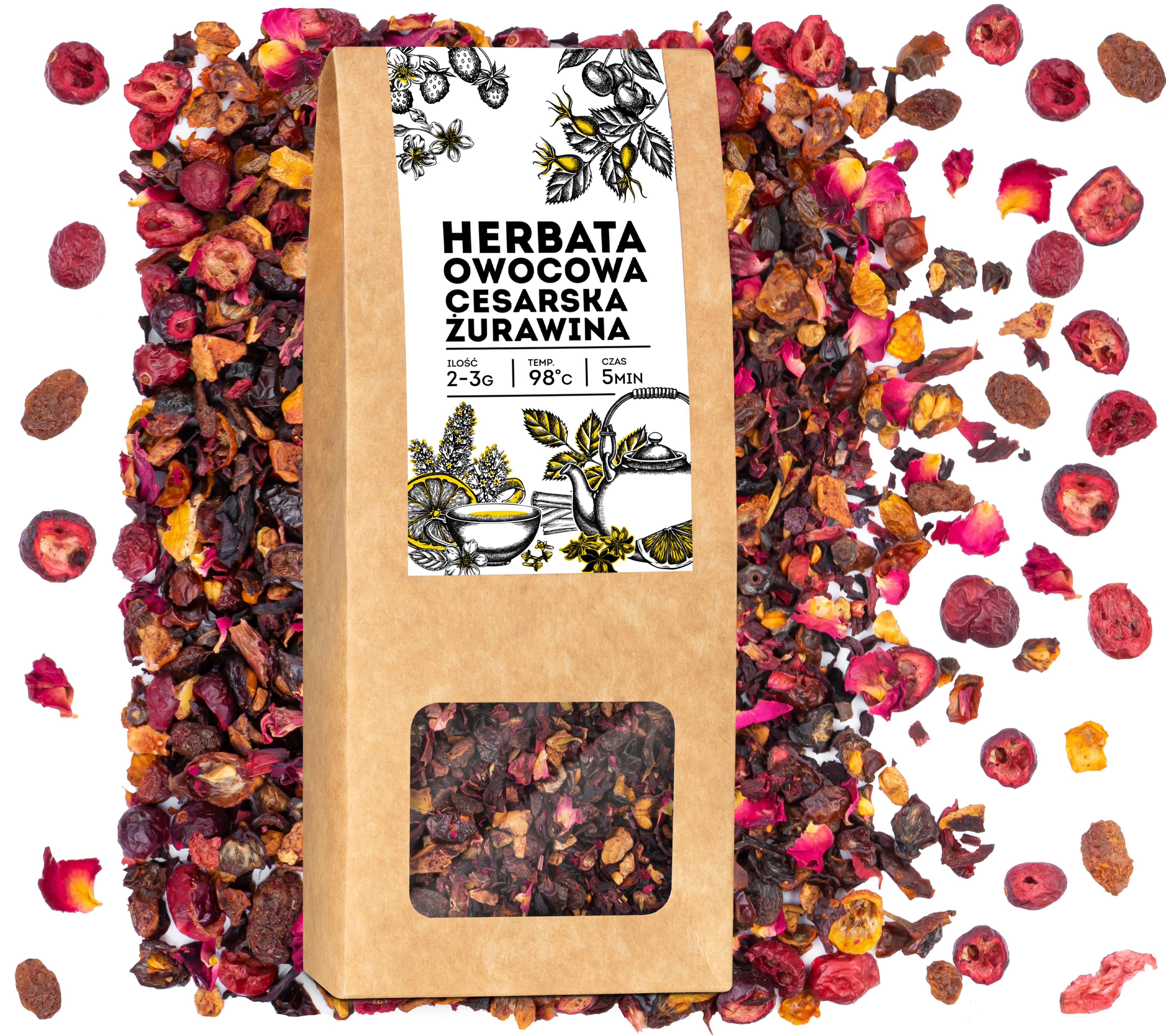 Specyfikacja produktu: Nazwa produktu: Herbata owocowa Cesarska Żurawina Waga netto: 50 g Rodzaj: Herbata owocowa (bez kofeiny) Skład: hibiskus, jabłko suszone, żurawina, aronia, skórka pomarańczy, aromaty naturalne Smak i aromat: wyrazisty, owocowy, lekko kwaskowy z dominującą nutą żurawiny Kolor naparu: intensywnie czerwony Sposób przygotowania: 1 łyżeczkę herbaty (ok. 2 g) zalać 200 ml wrzącej wody (100°C), parzyć pod przykryciem 5–10 minut Zastosowanie: do picia na gorąco lub na zimno Przechowywanie: przechowywać w suchym i chłodnym miejscu, w szczelnie zamkniętym opakowaniu