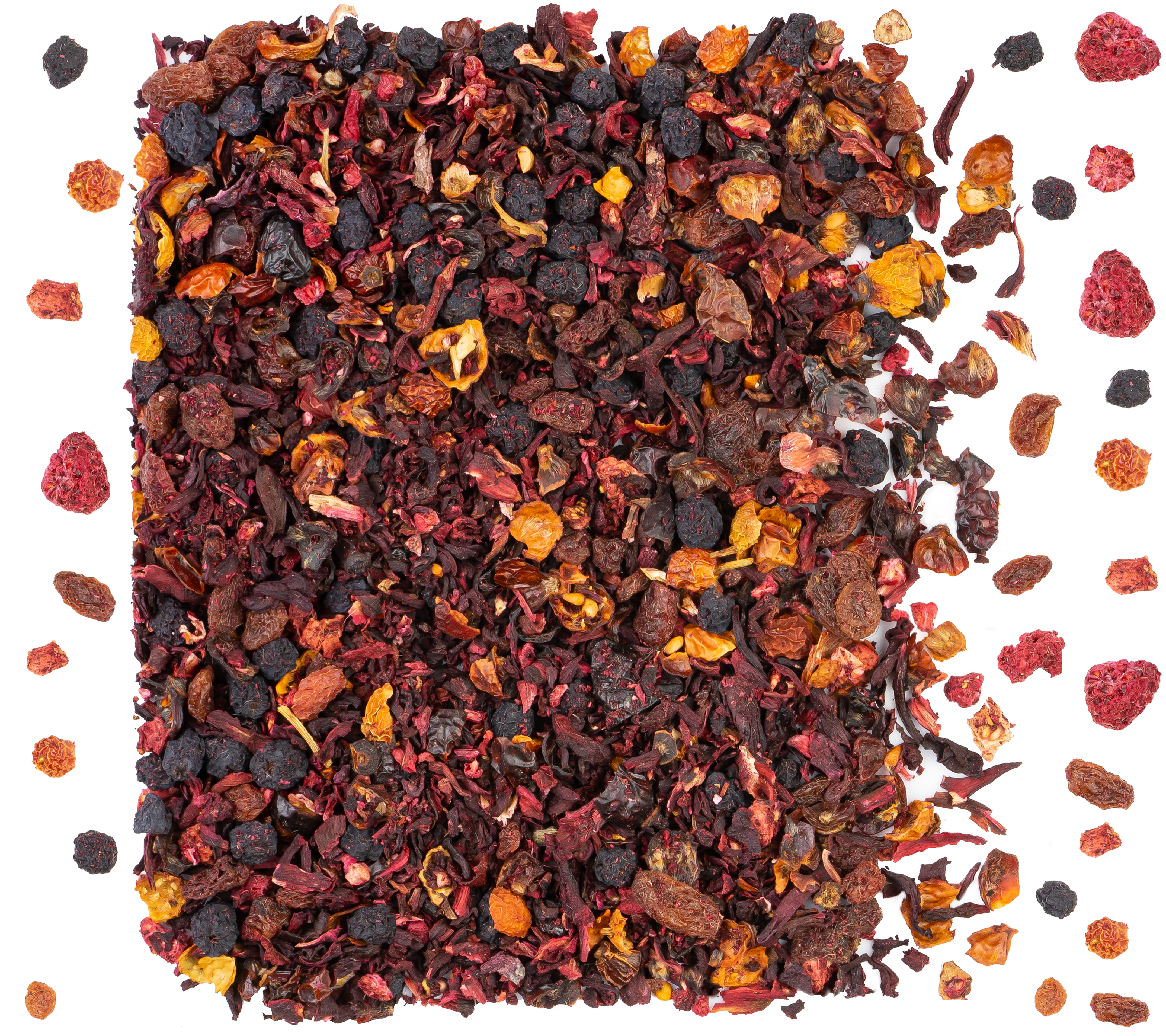 Składniki: hibiskus, skórka róży, rodzynki (rodzynki, olej słonecznikowy, substancja konserwująca E220), aronia, malina liofilizat, aromat.