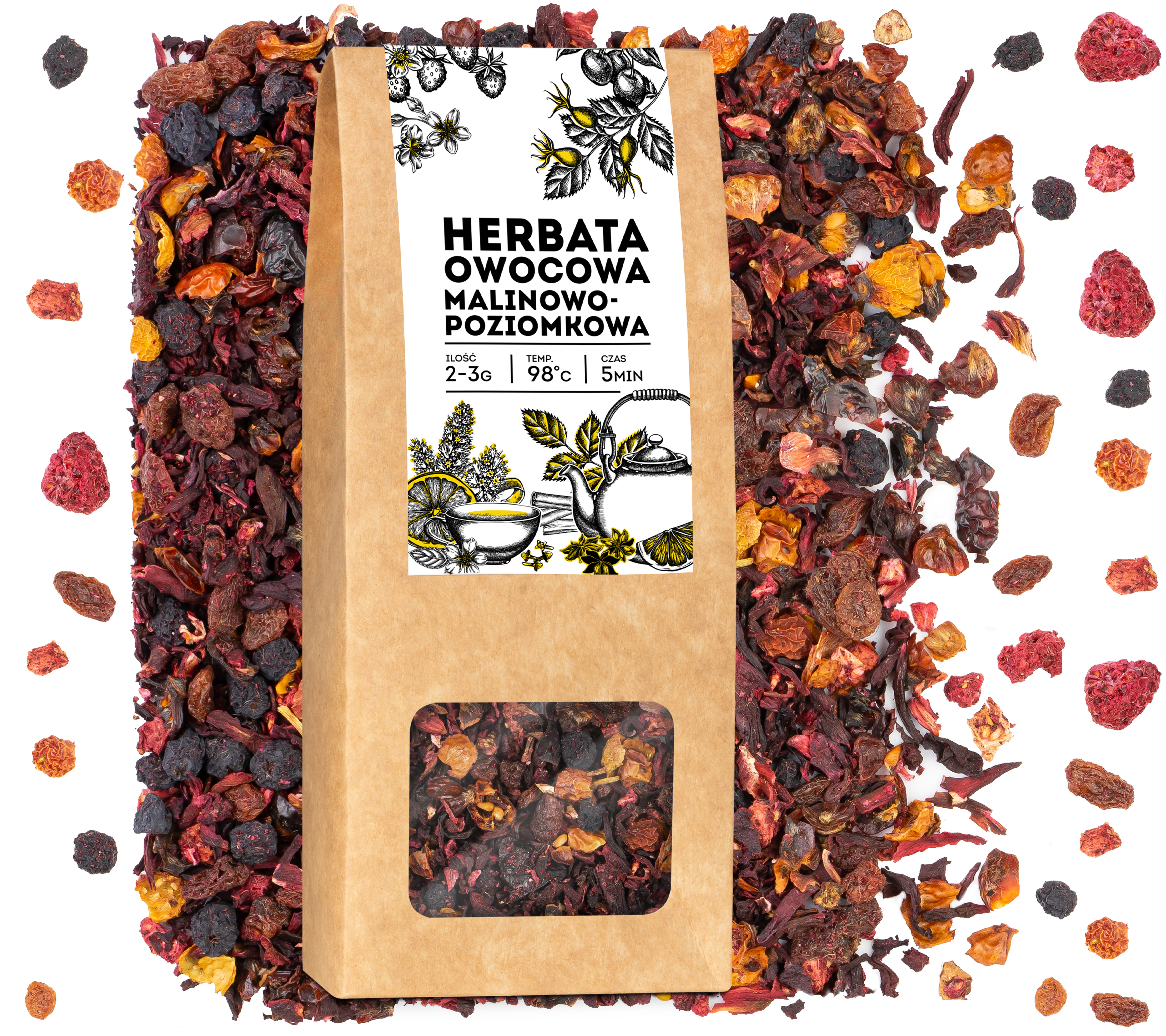 Skład: hibiskus, jabłko suszone, owoc maliny, owoc poziomki, aromaty naturalne