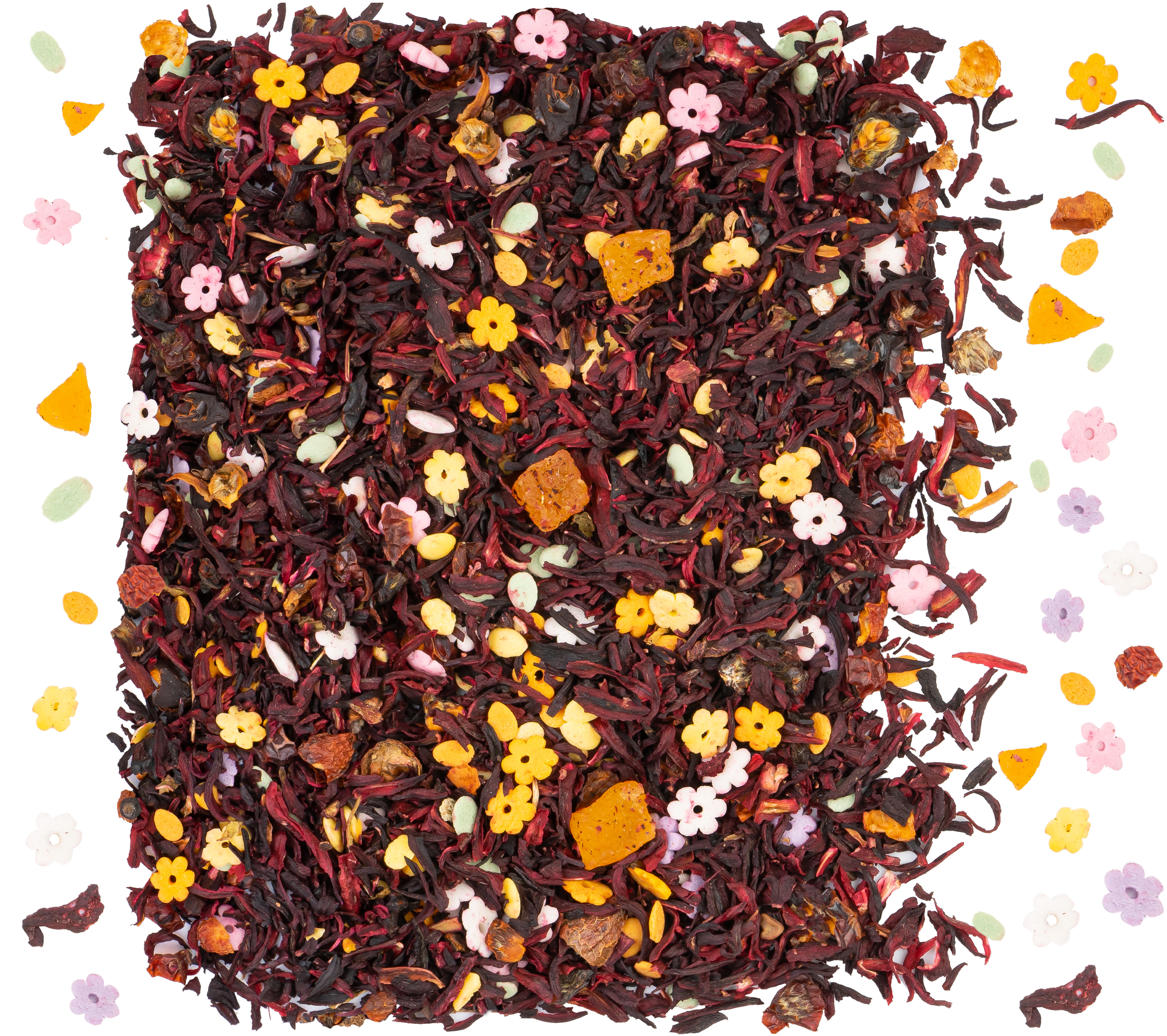 Składniki: hibiskus, dekoracje cukrowe (cukier, mąka ryżowa, olej rydzowy, skrobia ziemniaczana, aromat, koncentrat soku z buraków, barwniki: E100, E101, E120, E132,), papaja kandyz. (papaja, cukier, substancja konserwująca SO2), dekoracje cukrowe (cukier, mąka ryżowa, olej rydzowy, skrobia ziemniaczana, aromat, koncentrat soku z buraków, barwniki: E100, E101, E141), skórka róży, aromat.