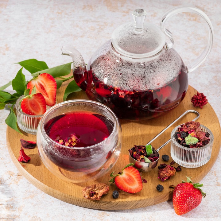 Składniki: hibiskus, jabłko, skórka róży, aromat, truskawka liofilizowana, owoce egzotyczne (w zależności od partii)