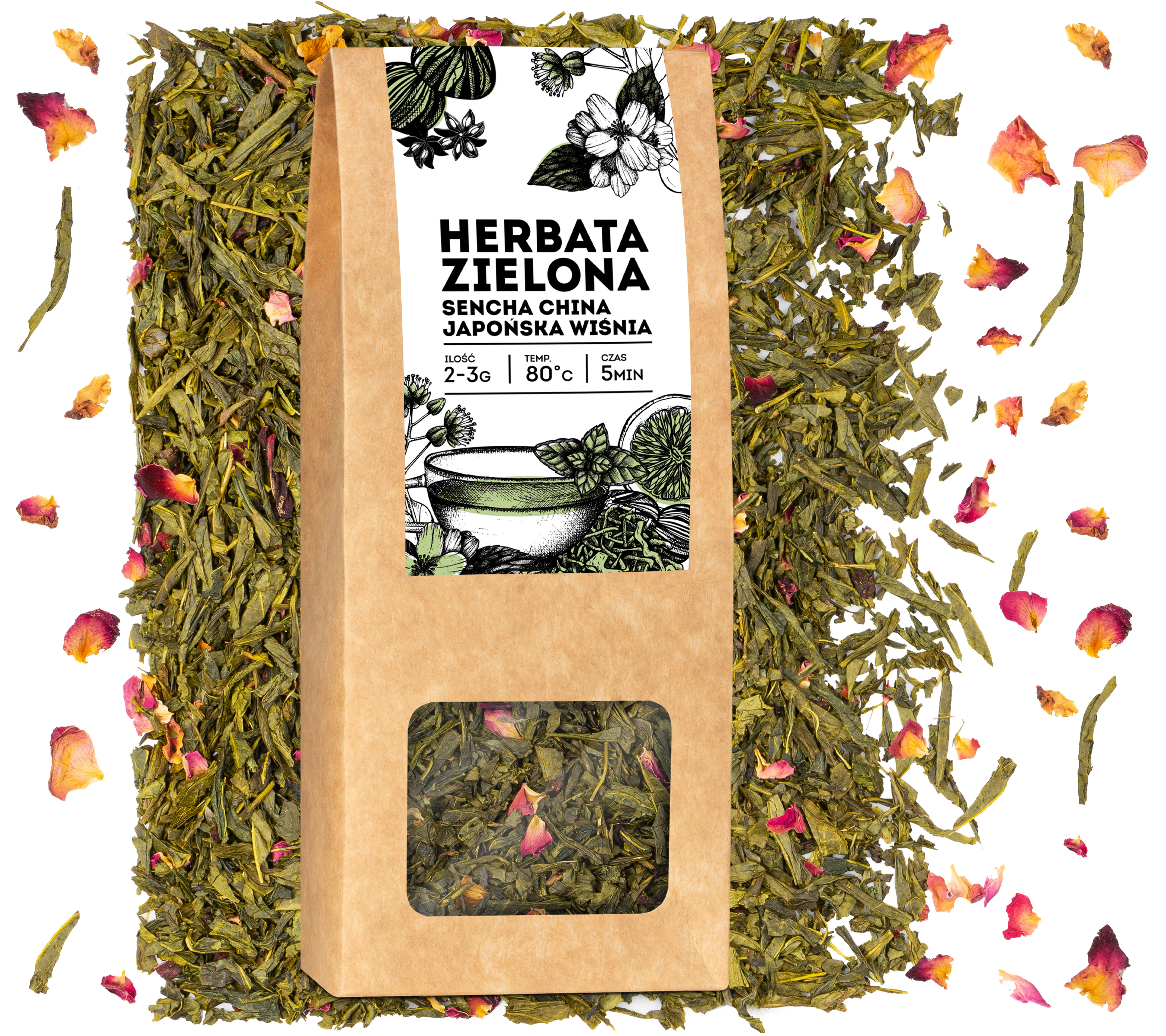 Zielona herbata liściasta JAPOŃSKA WIŚNIA sencha sypana płatki róż tea 50g